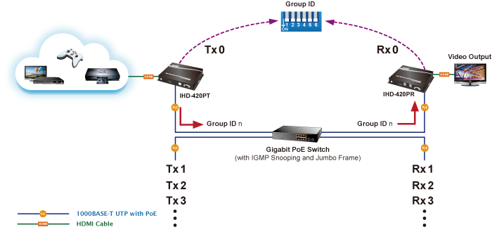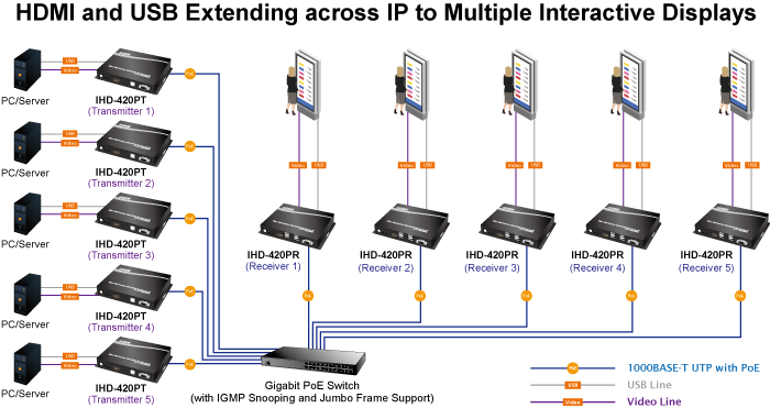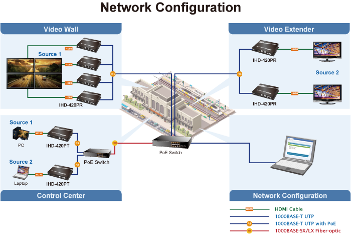 The IHD-420 series allows a network configuration via a central computer over the same LAN within a certain distance. By fully leveraging the Gigabit Ethernet switches with 802.1Q VLAN function, multi-casting can be performed to allow more video sources/senders in the network and be remotely managed. Adjusting and matching video channel setting is simple with the DIP switch on both the IHD-420PT and IHD-420PR. The video distribution is easily deployed through Plug and Play.