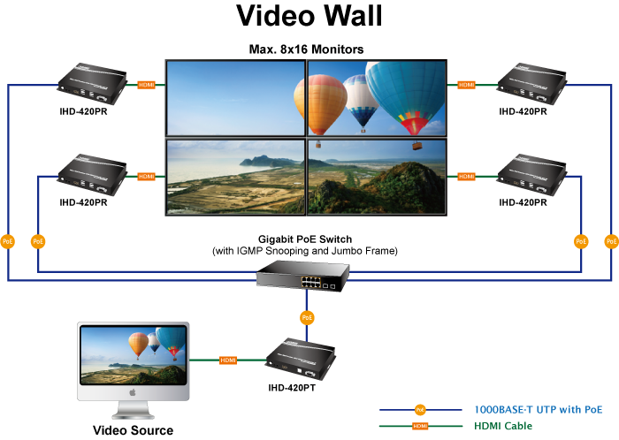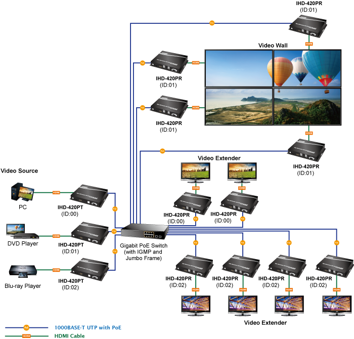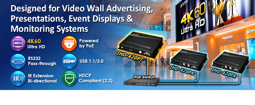 PLANET IHD-420 HDMI/USB Extender Video Wall over IP with PoE delivers a great 4K video distribution solution with refreshing 60 frames per second , waking an efficient and effective advertising deployment. The IHD-420 series is the combination of the transmitter, IHD-420PT, and the receiver, IHD-420PR. They can be used as an audio, video and IR extender over IP, and applied to point to point, point to multi-point, multi-point to multi-point and eye-catching video walls of up to 16 by 8 displays.